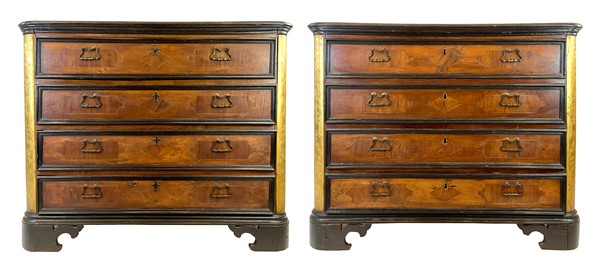 Coppia di cassettoni in noce con fronte a quattro cassetti lastronati e filettati in legni vari e specchiature radicate. Profili ebanizzati, montanti incisi e dorati a motivi stilizzati. Piedi a mensola. Lombardia, secolo XVIII (cm 140x115x55) (difetti e restauri)