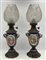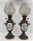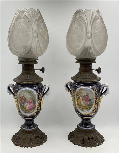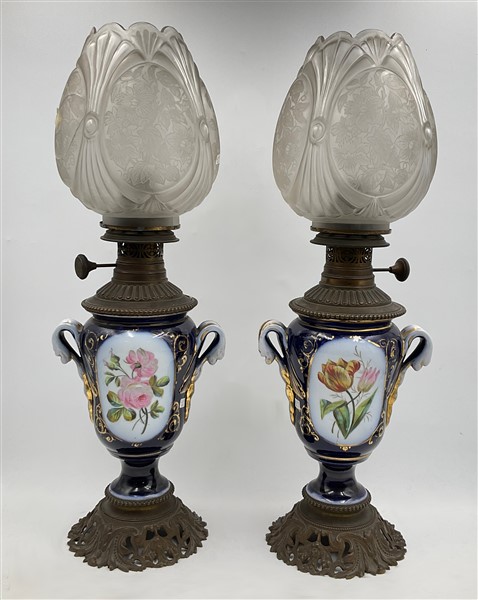 Coppia di lampade ad olio in porcellana policroma a vaso biansato, base e collo in metallo con paralume in vetro (h cm 58), elettrificate in epoca successiva (difetti e rotture)