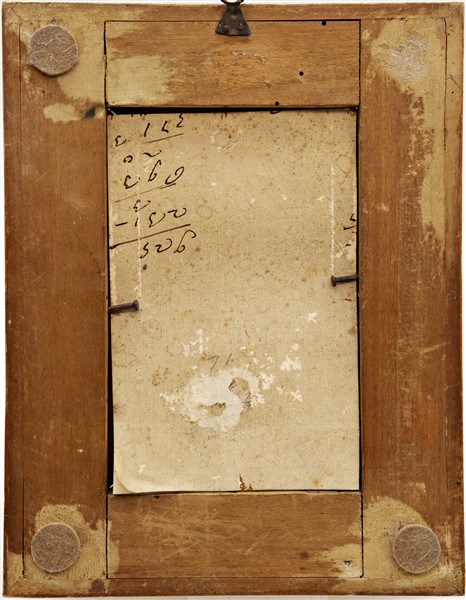 Ignoto. Miniatura raffigurante la Vergine col Bambino entro riserva centinata su fondo ad angeli musicanti, tecnica mista su pergamena (cm 16x11) in cornice dorata (difetti)