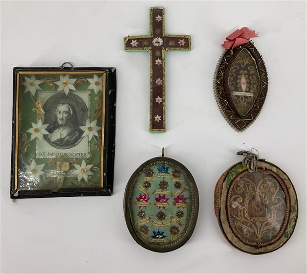 Lotto composto da cinque reliquie e santini di diversa forma e decoro, alcune i