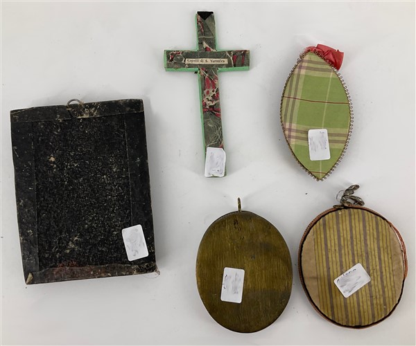 Lotto composto da cinque reliquie e santini di diversa forma e decoro, alcune in custodia, epoche diverse (difetti)