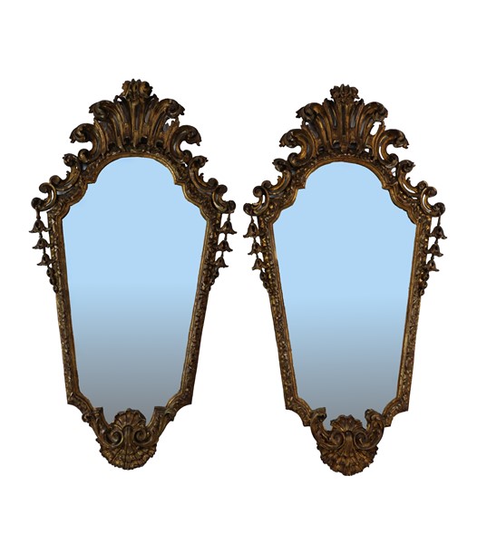 Coppia di specchiere di forma mossa in legno intagliato e dorato con cimasa tra