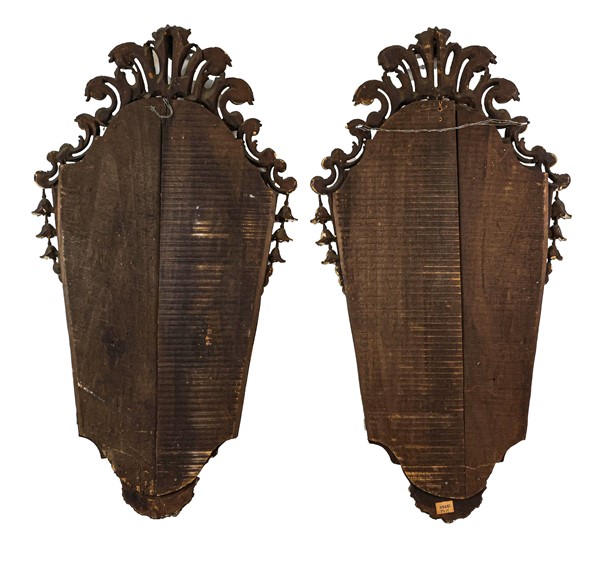 Coppia di specchiere di forma mossa in legno intagliato e dorato con cimasa traforata a volute (cm 92x48) (difetti)
