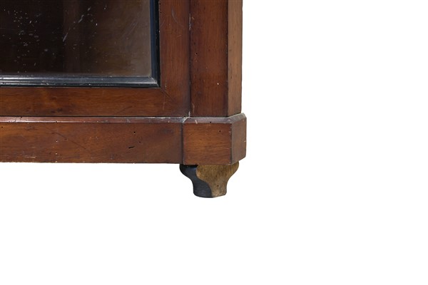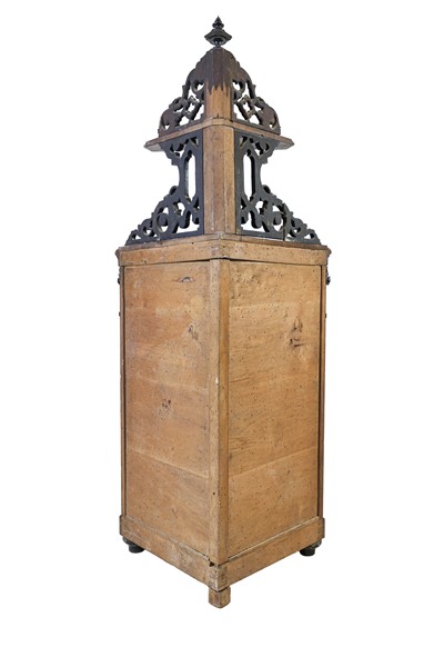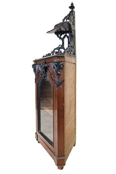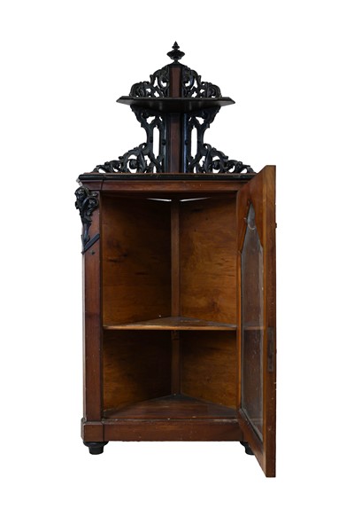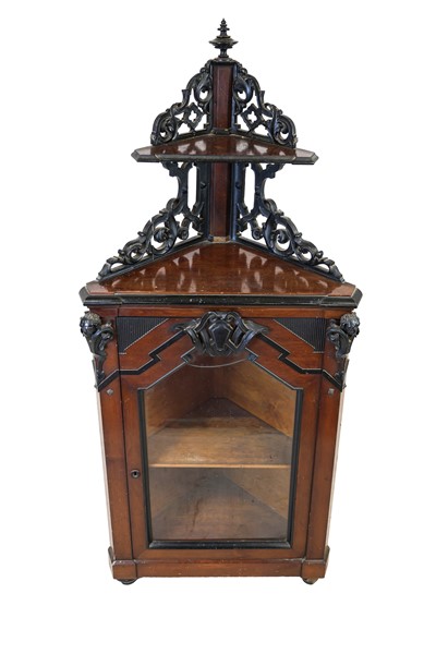 Cantonale con alzata a due ripiani e fregi traforati, parte inferiore ad un'anta a vetro, profili ebanizzati. Fine secolo XIX (cm 46x139x46) (difetti)