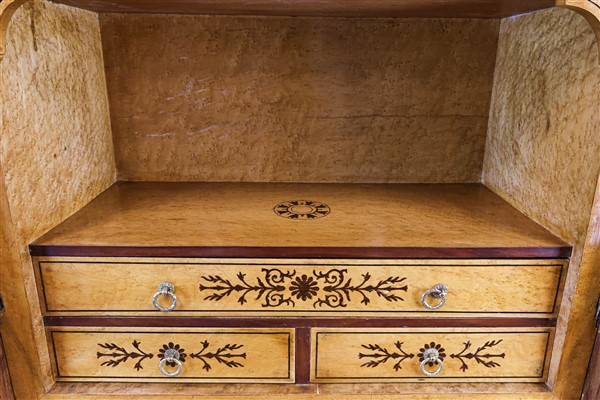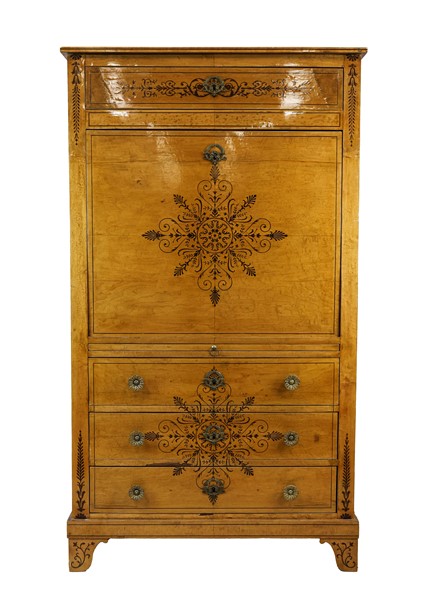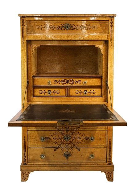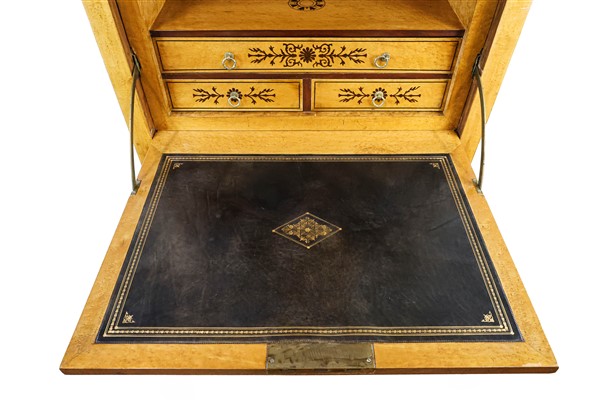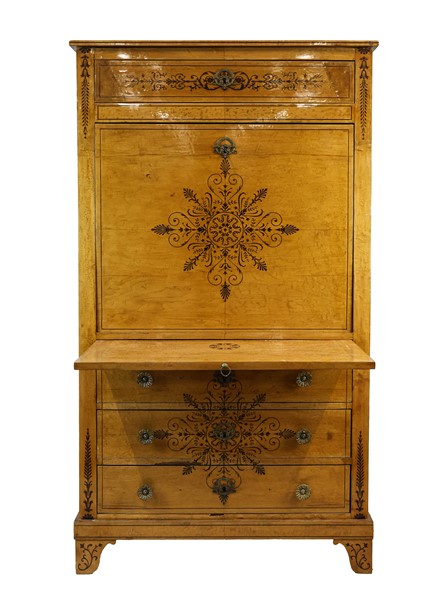 Secretaire impiallacciato in radica chiara e intarsiato a palmette e motivi sti