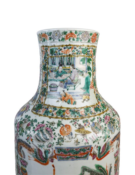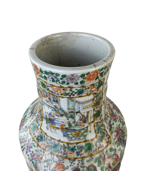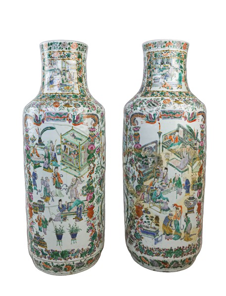 Coppia di vasi a balaustro famiglia rosa decorati scene di vita di corte entro riserve squadrate