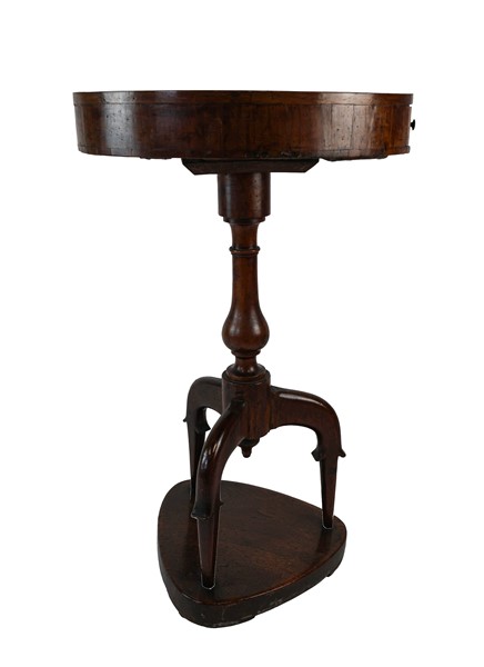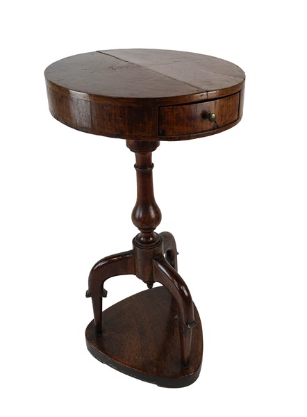 Tavolino con piano ovale in noce e cassetto nella fascia, sostegno tornito su tripode e base sagomata. Secolo XIX (cm 43x71x36) (difetti)