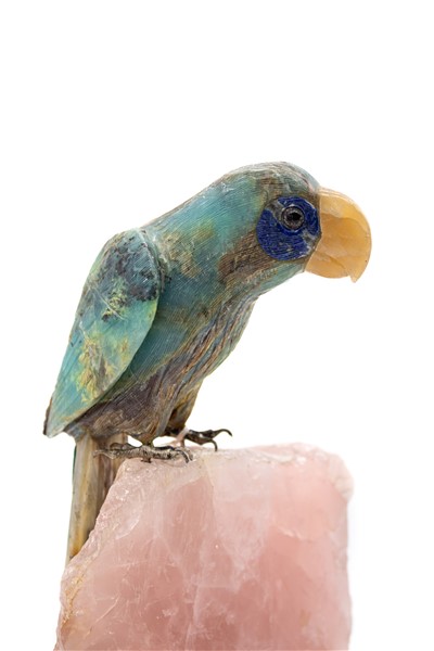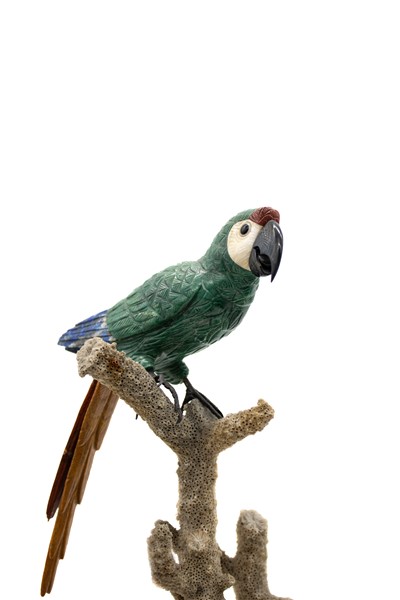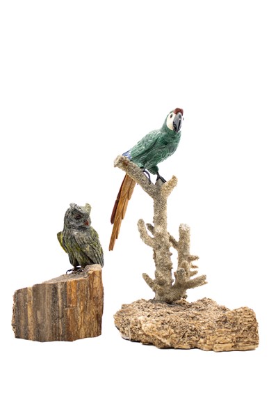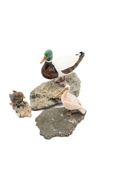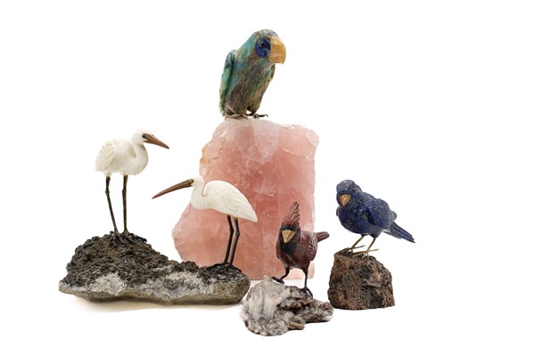 Lotto composto da tredici diverse figure di volatili in pietre dure e metallo d