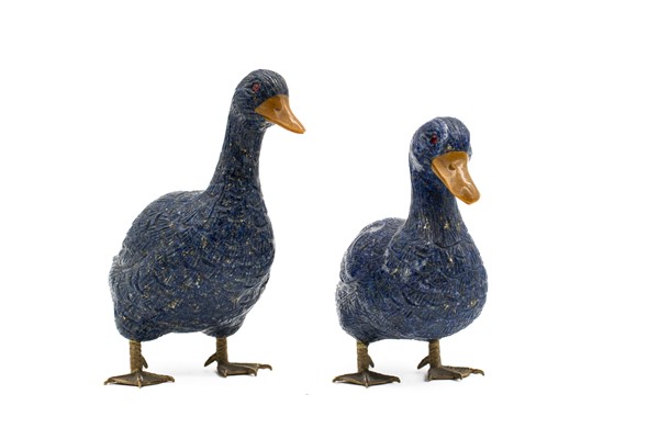 Lotto composto da tredici diverse figure di volatili in pietre dure e metallo di diversa forma (h max cm 30) (difetti)