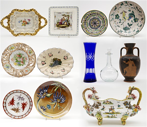 Cartone contenente numerosi oggetti in ceramica e vetro di diversa forma e decoro (difetti)