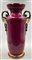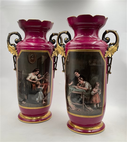 Manifattura del secolo XIX. Coppia di vasi biansati in porcellana decorata in policromia con scene di interno entro riserva su fondo rosso, profili in oro (h cm 55) (difetti e restauri)