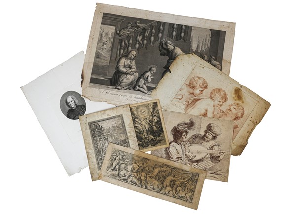 Lotto contenente numerose incisioni di antichi maestri, tra cui alcune da invenzioni di Marco Ricci e Andrea del Sarto, di tecniche e misure differenti