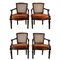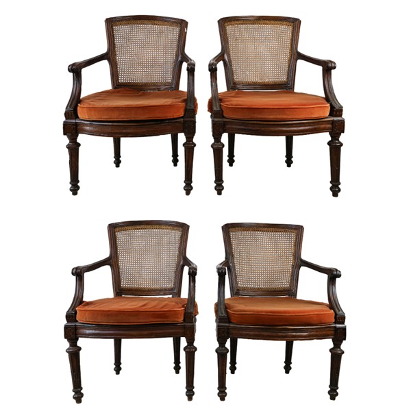Gruppo di quattro poltrone in noce con bordure e gambe scanalate, sedute e schi