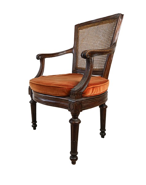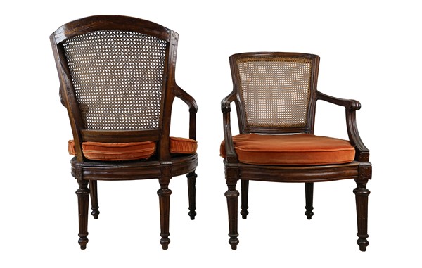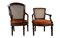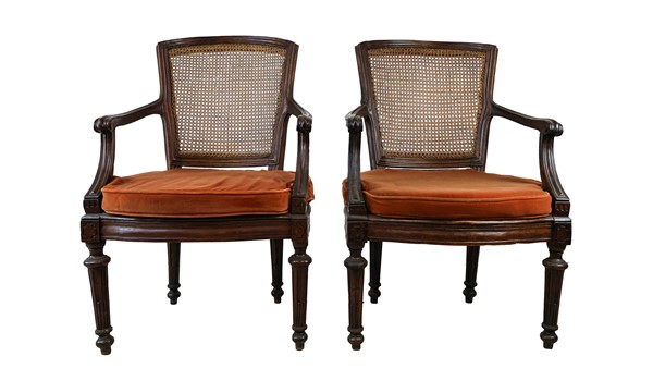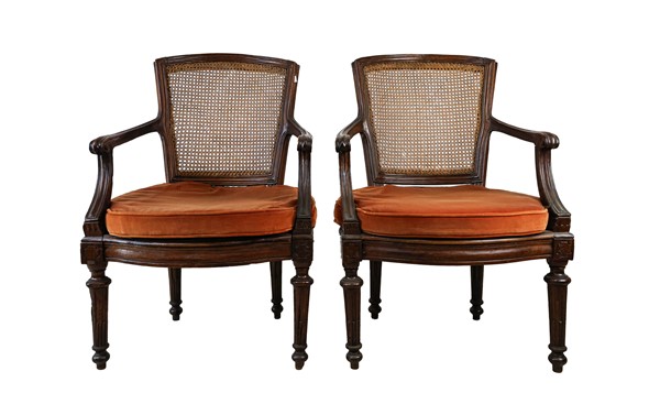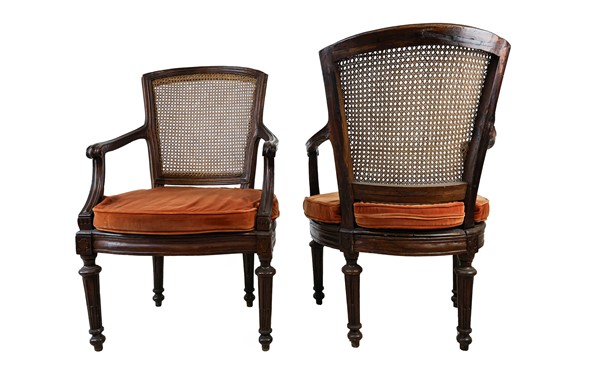 Gruppo di quattro poltrone in noce con bordure e gambe scanalate, sedute e schienali in paglia di Vienna. Piemonte, fine secolo XVIII (difetti)