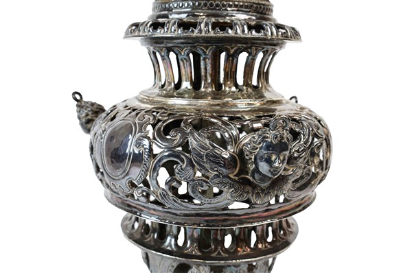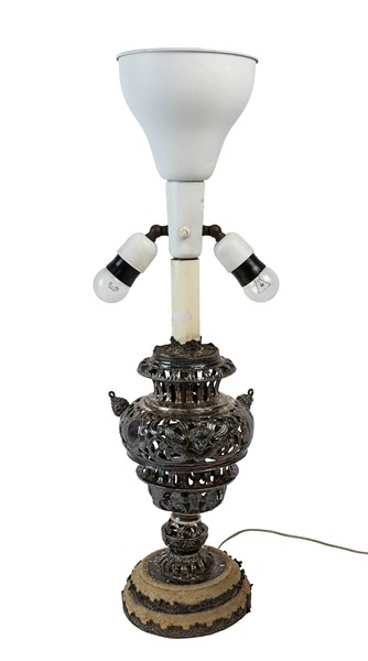 Base per lamapada ricavata da una lampada votiva in rame sbalzato, traforato e argentato con tre anse a teste d'angelo. Inizio secolo XIX (h cm 29) adattato a luce elettrica in epoca successiva (h tot cm 69) (difetti, restauri e mancanze)
