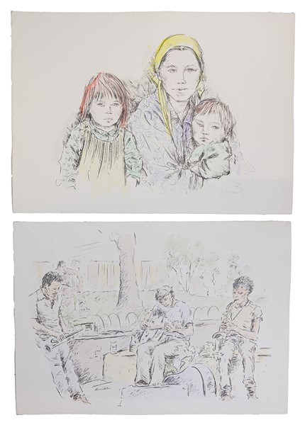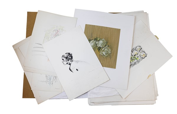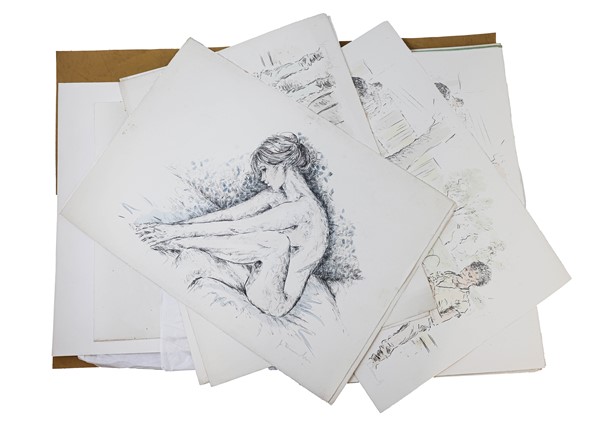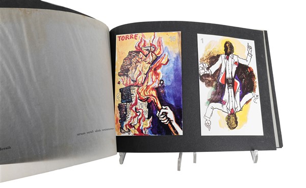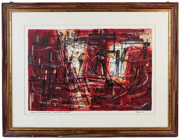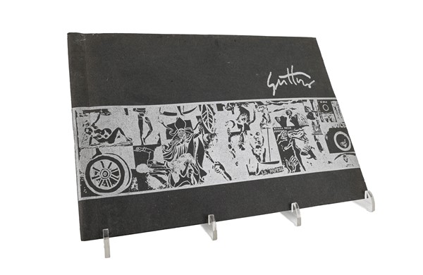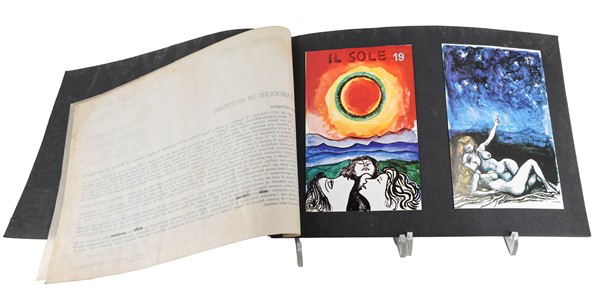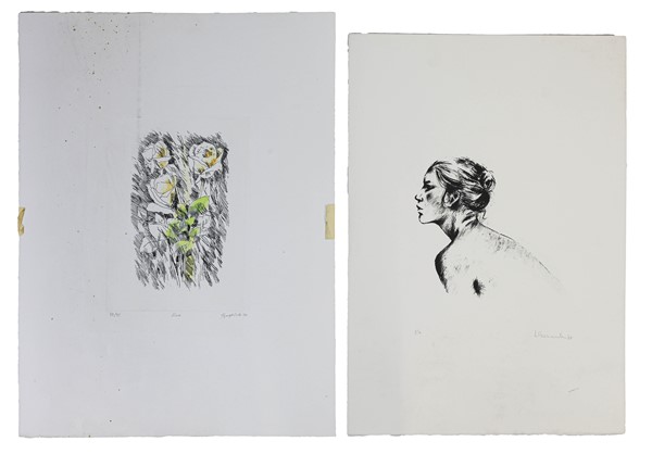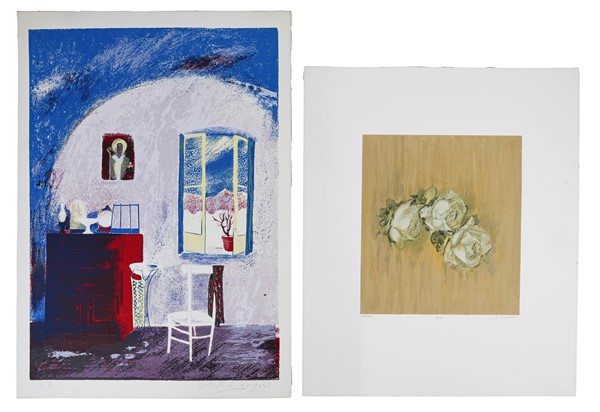 Lotto composto da tre litografie in cornice di soggetto, autori e misure differenti (misura max cm 56x77), un disegno a china raffigurante interno di bar non firmato (cm 34,5x49) in cornice, il volume illustrato "I tarocchi di Guttuso" e una cartella contenente numerose litografie di soggetti, autori e misure diverse (misura max cm 50x70)