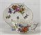 Manifattura di Dresda, secolo XIX. Tazzina con piattino in porcellana quadrilobata con decoro floreale policromo. Marcata sotto la base (tazzina h. cm 4; piattino d. cm 10) (difetti)