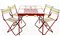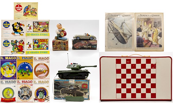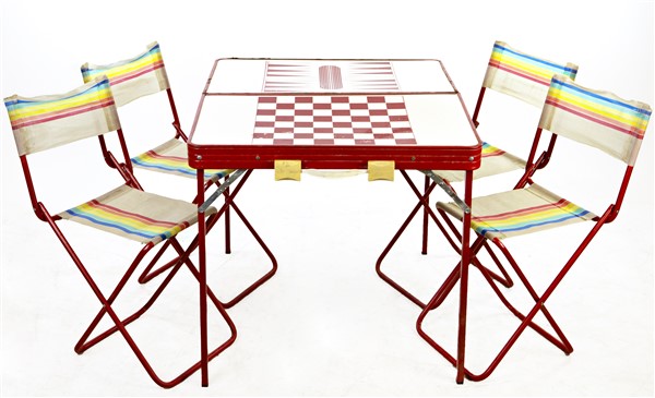 Lotto composto da tre diversi giochi in materiali vari entro custodie e un tavolino da gioco richiudibile contenente quattro sgabelli pieghevoli, uniti ad alcuni fumetti (difetti)