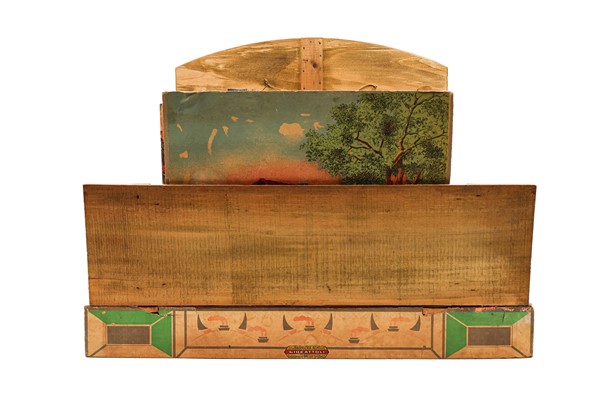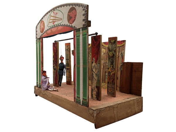 Barbera Achille Giocattoli, Biella. Teatrino a viaggio in legno e carta litografata a colori dotato di quattro marionette con parti in terracotta (cm 55x47x28) (difetti e mancanze)