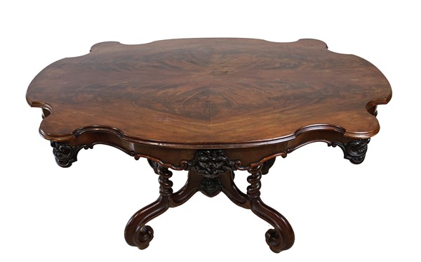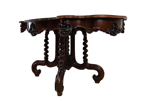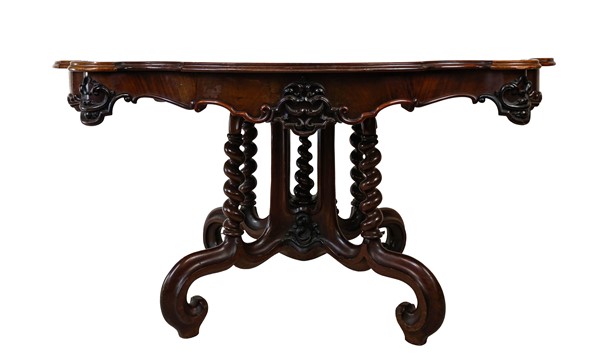 Tavolo da centro in legni vari con piano sagomato e sostegni con colonne tortili e piedi a voluta (cm 154x78x93) (difetti e restauri)