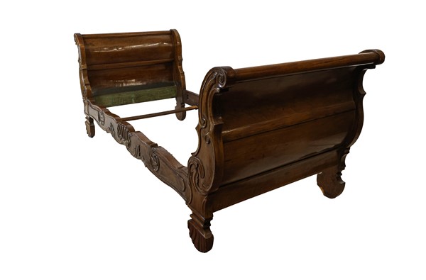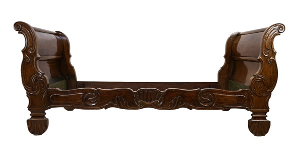 Letto a barca in noce con fronte decorato da intagli a valva di conchiglia e vo
