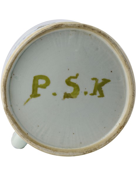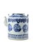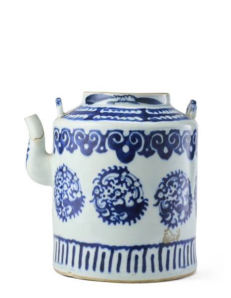Teiera cilindrica in porcellana bianca e blu decorata con motivi circolari a fa