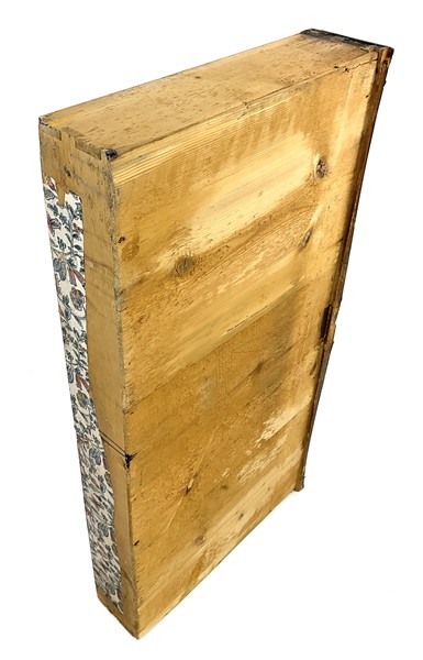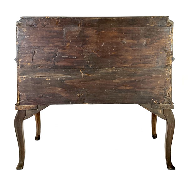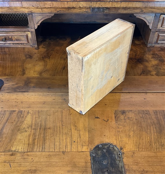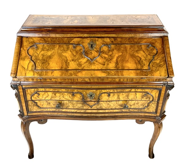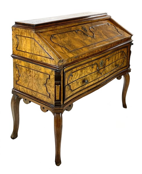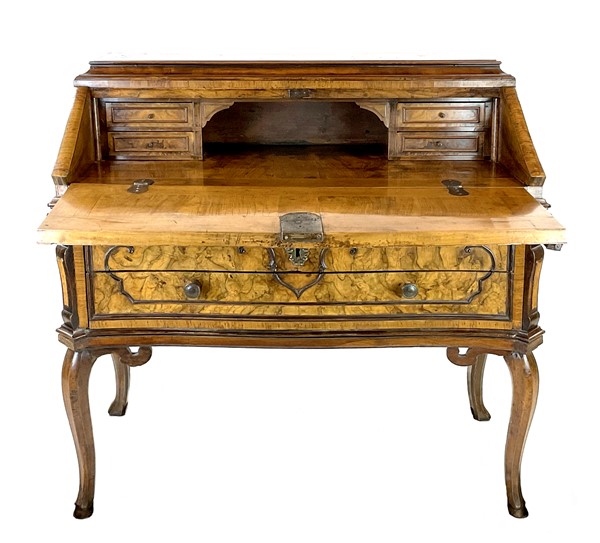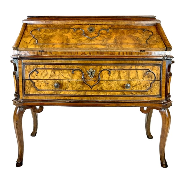 Ribalta lombarda lastronata in noce e radica di noce con cornici mistilinee a rilievo, fronte a due cassetti e calatoia celante quattro tiretti e vano a giorno. Gambe mosse. Mobile costruito con elementi antichi (cm 110x106x55) (difetti)