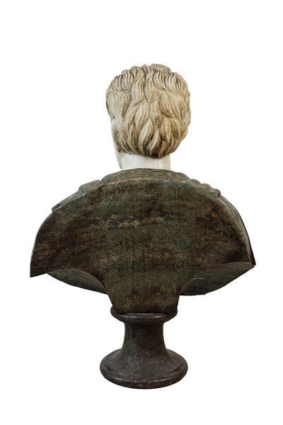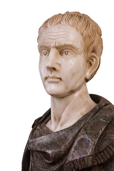 Lot 1648 | Busto di imperatore romano ammantato in marmi vari. Poggiante su base tornita (