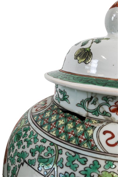 Coppia di potiches in porcellana policroma Famiglia Verde con riserve decorate a motivi floreali, animali e simboli buddisti. Cina, secolo XIX (h. cm 46) (difetti, restauri e mancanze)