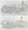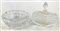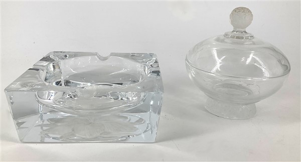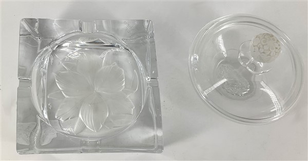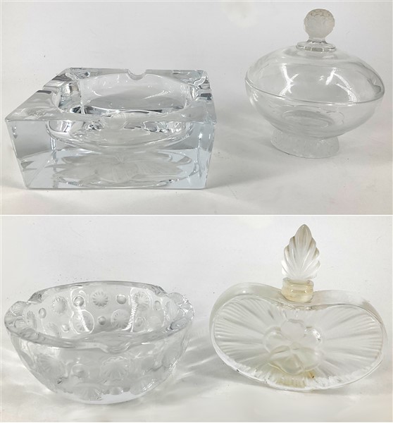Lotto composto da un posacenere e un porta profumo con tappo in vetro soffiato in stampo firmati a punta "Lalique France", unito a un portacaramelle con coperchio e un posacenere in vetro iscritto a punta "CASINO DE MONTECARLO" con marchio.