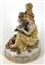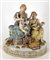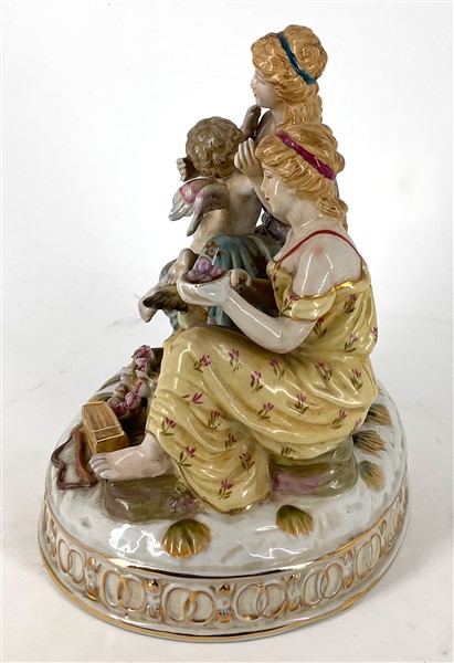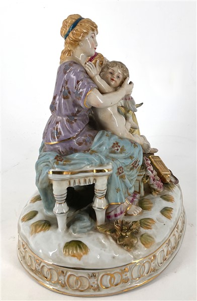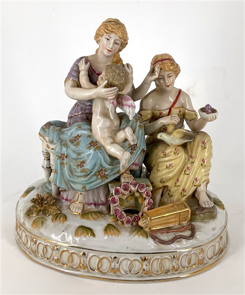 Manifattura tedesca, inizio secolo XX. Gruppo in porcellana policroma con profili in oro raffigurante scena allegorica con amorino (h cm 21) (lievi difetti)