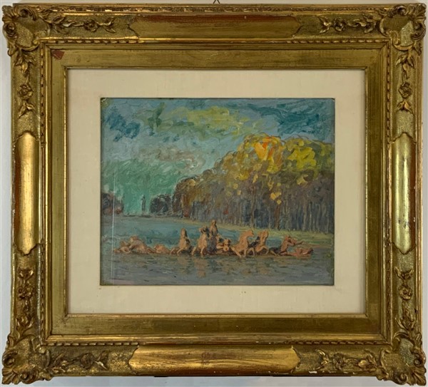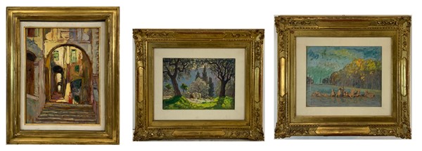 Scuola francese di inizio secolo XX, lotto composto da tre "Paesaggi", olio su