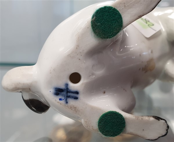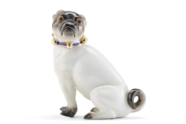 Manifattura del secolo XX. Da un modello di Meissen da Johann Joachim Kaendler. Carlino seduto con collare blu in porcellana policroma. Marcato alla base e numerale 68 incusso (h. cm 10) (difetti e restauri)