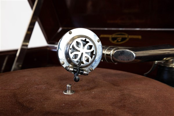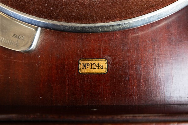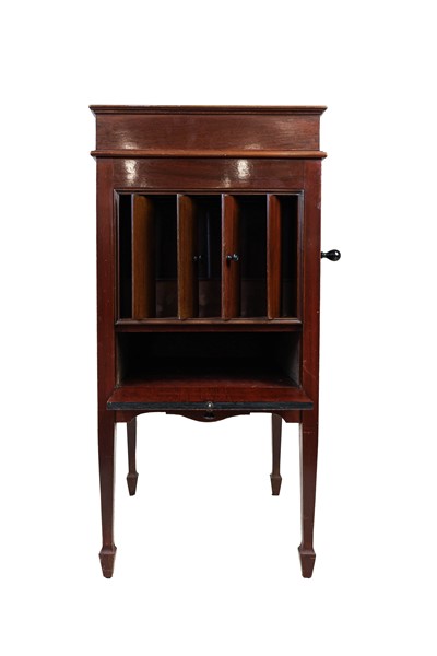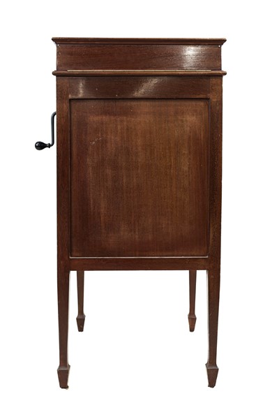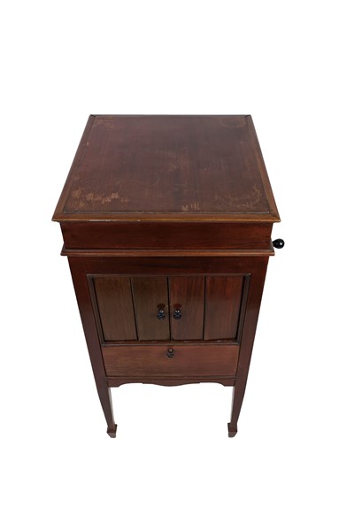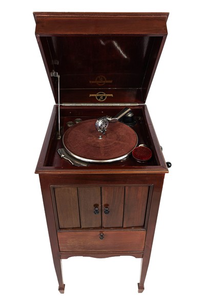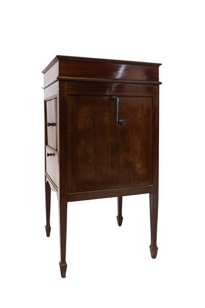 Columbia Graphophone Company. Grammofono con mobiletto in mogano e manovella la