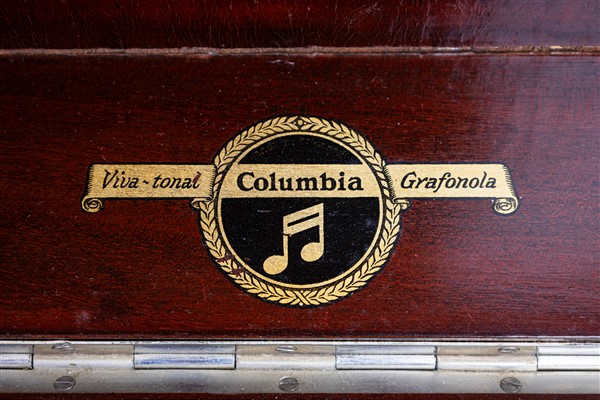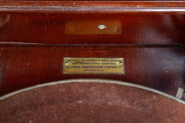 Columbia Graphophone Company. Grammofono con mobiletto in mogano e manovella laterale (cm 43x88x47) (difetti)