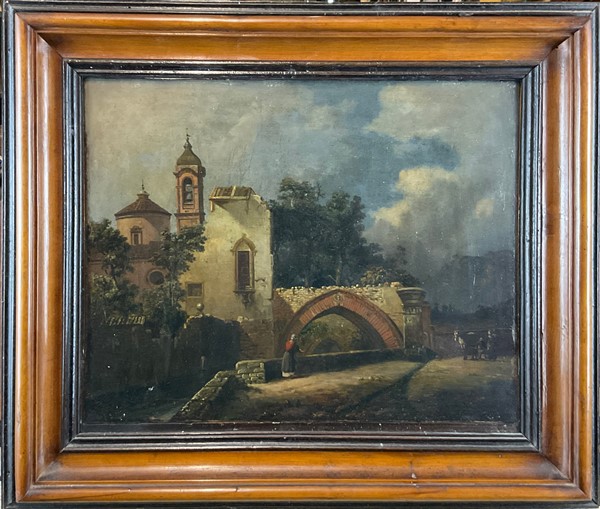 Scuola del secolo XIX, Coppia di Paesaggi ad olio su tela (cm 36x46) in cornici