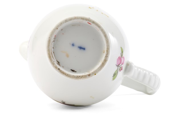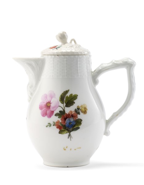 Manifattura di Berlino, secolo XVIII-XIX. Piccola caffettiera piriforme con coperchio in porcellana bianca dipinta in policromia a mazzetti di fiori, fascia e coperchio a finto vimini a rilievo, ansa sagomata e presa del coperchio a bocciolo a tutto tondo. Marcata sotto la base (h. cm 12) (difetti)