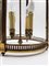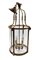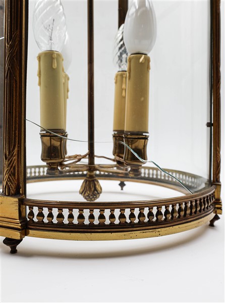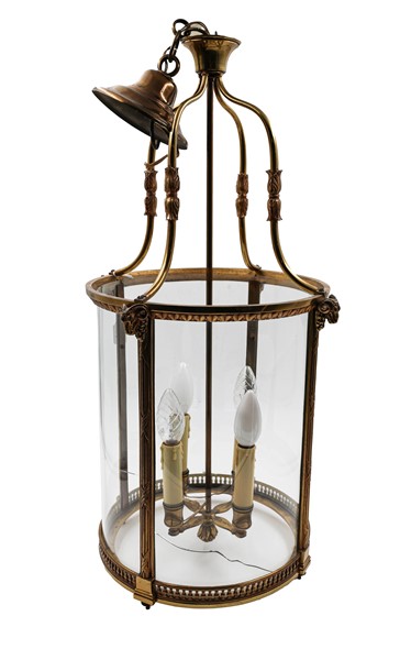 Lanterna a sospensione di forma cilindrica a quattro luci con struttura in ottone e vetro decorata da lesene culminanti a testa di ariete (d cm 33, h cm 79) (difetti e rotture al vetro)