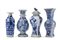 Gruppo di quattro vasi in porcellana bianca e blu decorati con fiori, paesaggi e motivi geometrici.