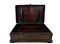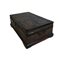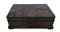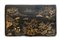Contenitore in legno e vimini con coperchio laccato e decorato in oro a paesaggio orientele con figure su fondo nero (cm 71x24x45) (difetti)