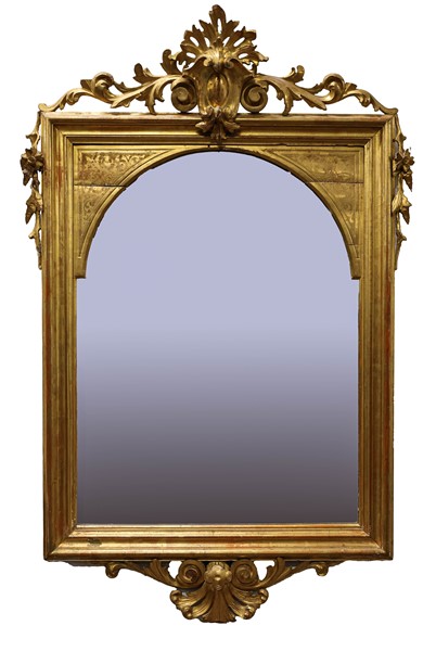 Specchiera di forma rettangolare in legno intagliato dorato e bulinato a volute, fregi scolpiti a foglie e fiori ed elementi stilizzati. Secolo XIX (cm 150x90) (difetti)