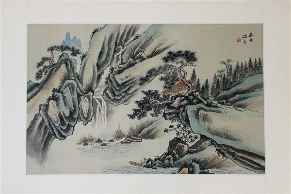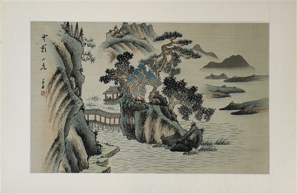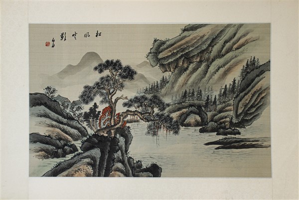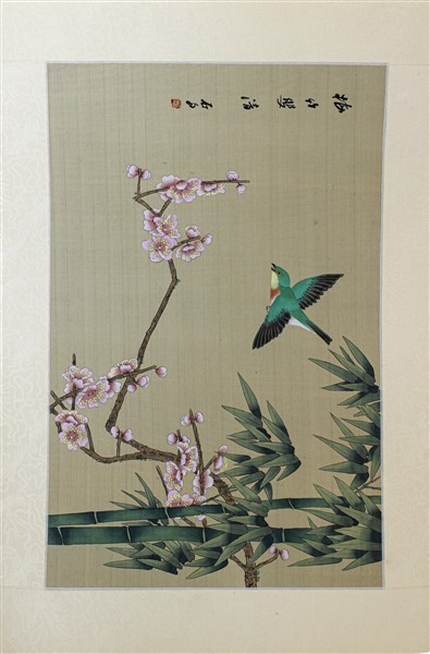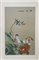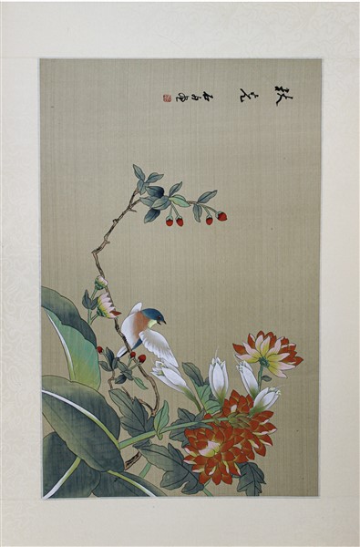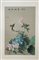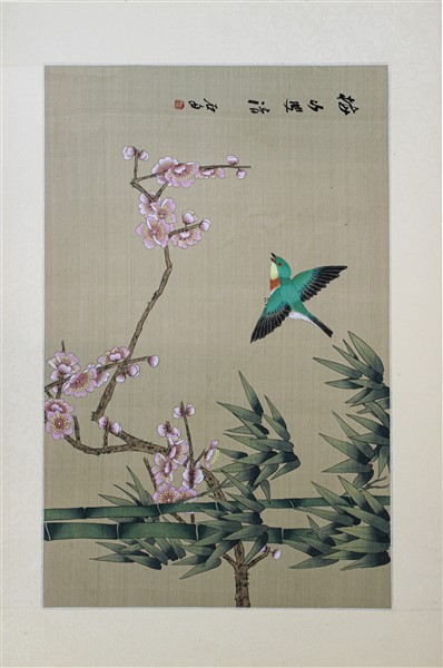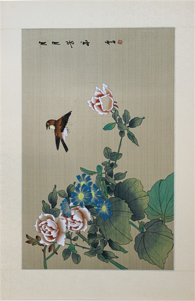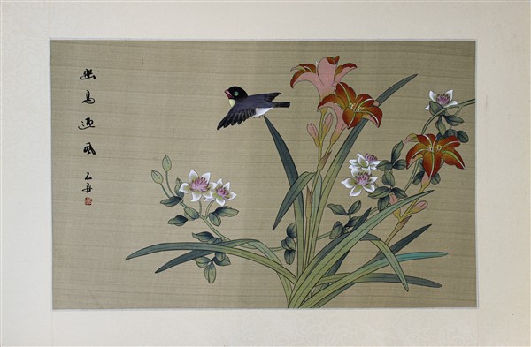 Cartella contenente venticinque pannelli su seta dipinta a fiori, volatili e paesaggi con incrizioni.