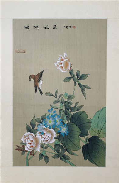 Cartella contenente venticinque pannelli su seta dipinta a fiori, volatili e pa