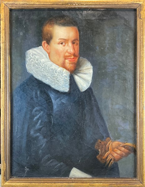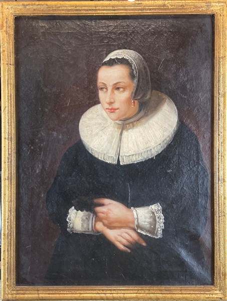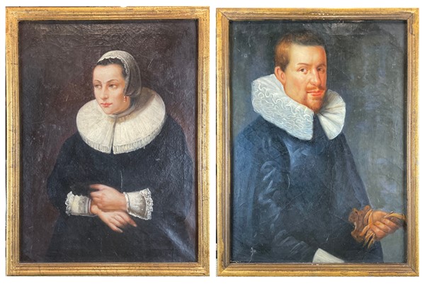 Nello stile fiammingo seicentesco, secolo XX. Ritratti di coniugi, coppia di oli su tela, (cm 40x30) in cornice (lievi difetti)