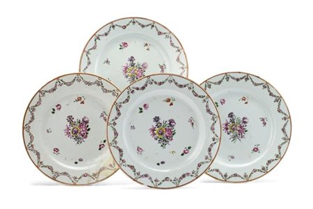 Manifattura della Compagnia delle Indie, Cina, secolo XVIII. Gruppo di quattro piatti in porcellana policroma con decoro a tralci di fiori, tesa a ghirlande sospese (d. cm 23) (difetti e restauri)