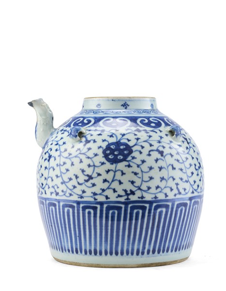 Lot 1907 | Grande teiera in porcellana bianca e blu decorata con motivi floreali stilizzat