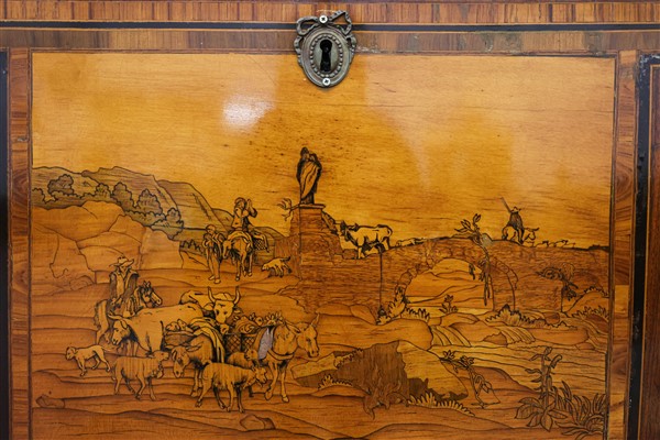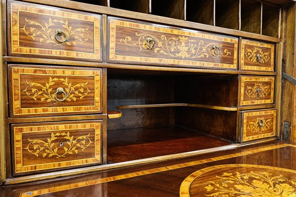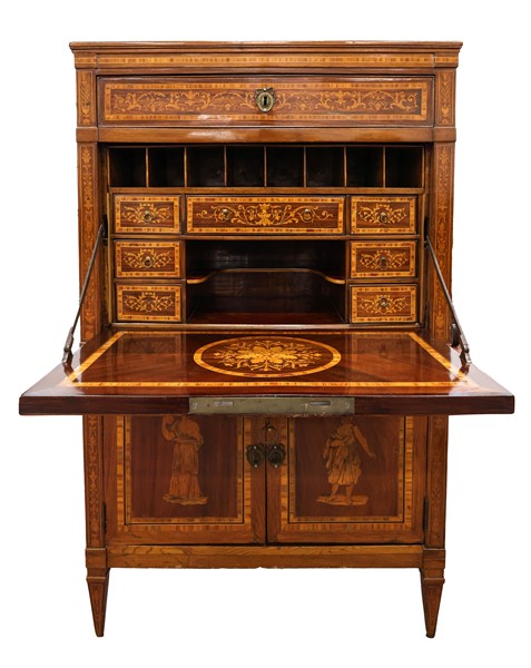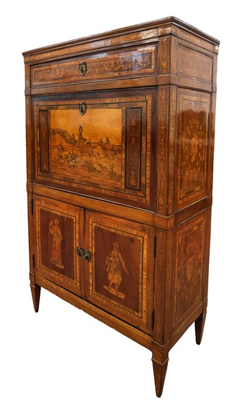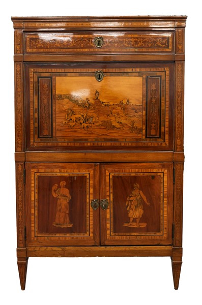 Secretaire lastronato in mogano filettato e intarsiato in legni vari. Cassetto nella fascia decorato a girali di foglie intervallate da volti maschili. Anta ribaltabile intarsiata con scena pastorale e figura in preghiera, sopra due sportelli centrati da figure allegoriche, fianchi con cartelle con profili sopra decoro floreale (cm 88x143x41) (difetti e mancanze) (non si apre anta e cassetto)