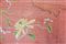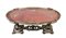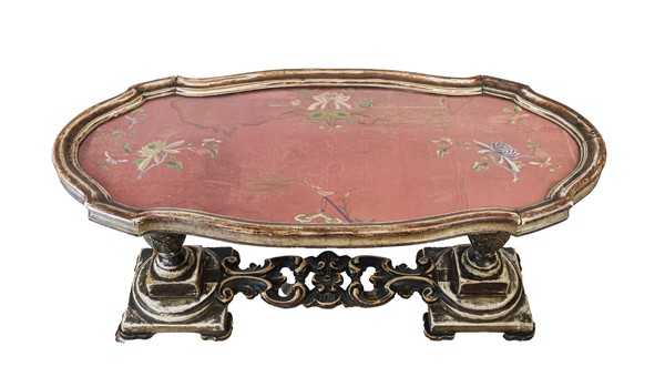 Tavolino da salotto in legno laccato con doppio sostegno a vaso e traversa di raccordo traforata, piano sagomato con tessuto ricamato sotto vetro (cm 110x51x51) (difetti)