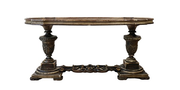 Tavolino da salotto in legno laccato con doppio sostegno a vaso e traversa di r