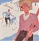 Raimund Wörle (Innsbruck 1896 - 1979) Maestro di sci;Incisione su linoleum a colori, 11,2 x 10,7 cm